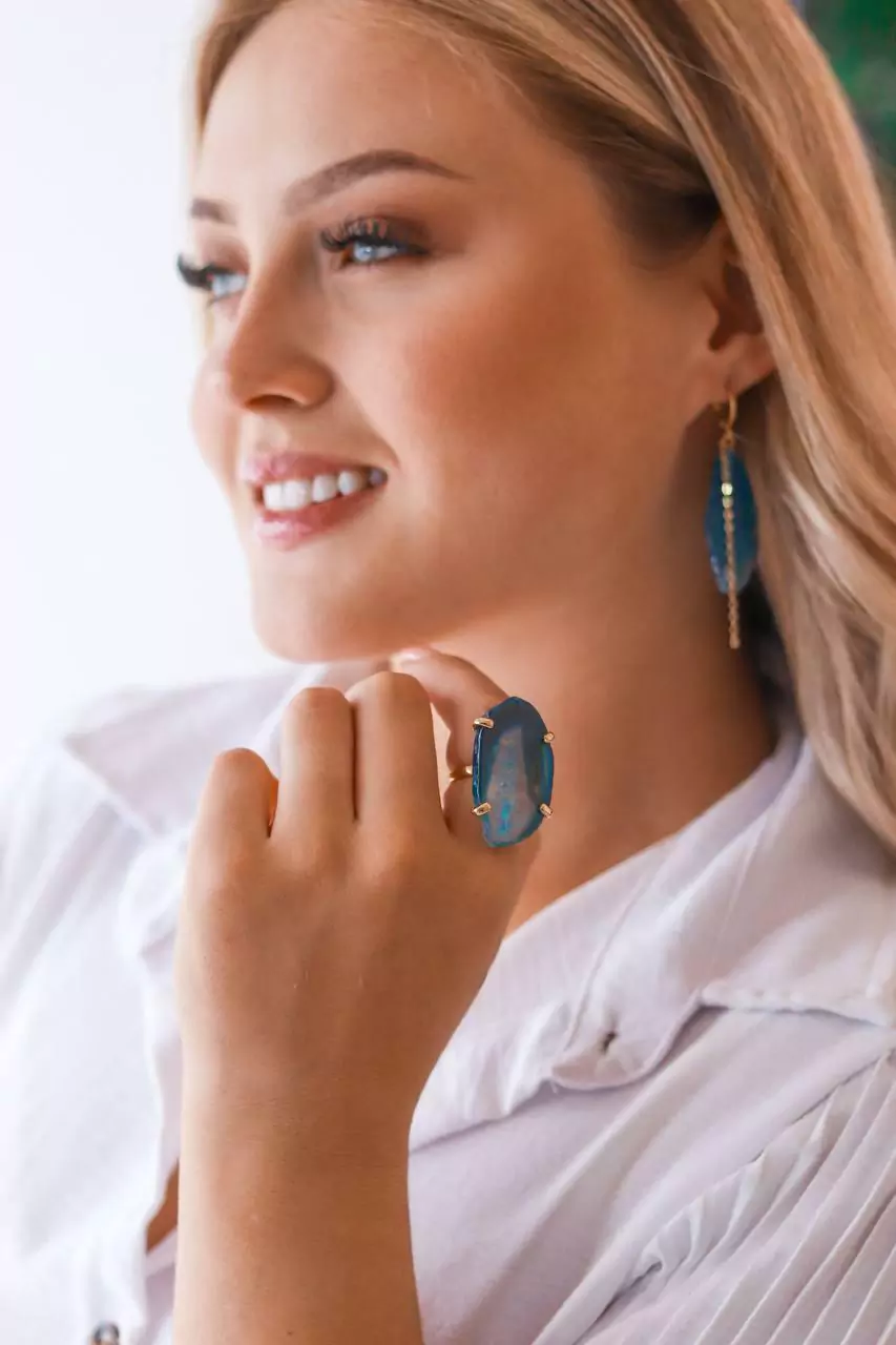 Transforme seu visual com o Anel Ajustável Chapa de Ágata Azul Banho Ouro, uma peça que combina elegância e energia. Este anel é feito com uma pedra de ágata tingida, conhecida como a pedra da energia, perfeita para elevar o seu estilo e promover um senso de equilíbrio e harmonia.