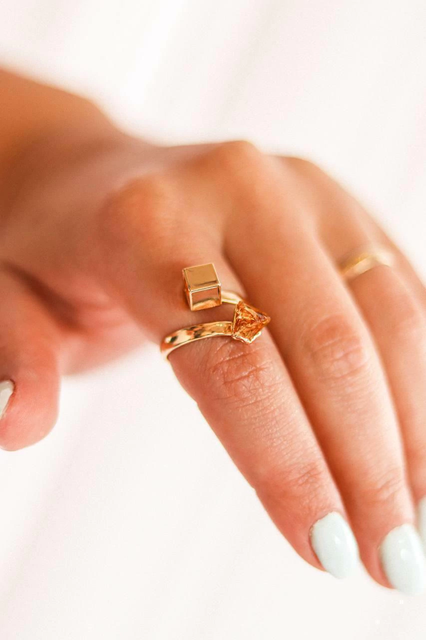 Este anel une o brilho contemporâneo do ouro com a força bruta e natural do citrino, pedra conhecida por seu visual único e propriedades energéticas. O design moderno, com estrutura aberta e detalhe em cubo metálico, cria uma peça marcante e cheia de personalidade perfeita para compor looks autênticos e cheios de significado.