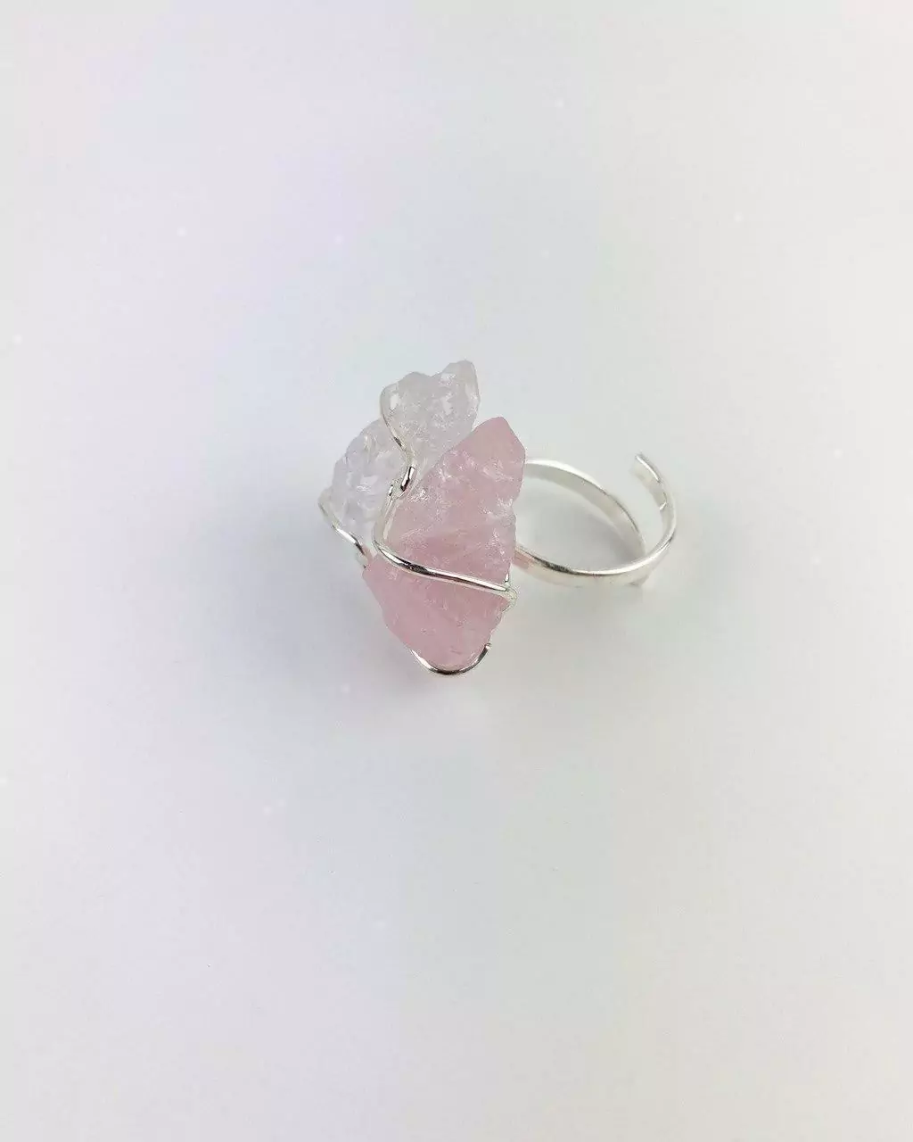 Anel Quartzo rosa com Cristal ajustável banho prata: Pedra Quartzo rosa é conhecida como pedra do amor. Pedra Cristal é conhecida como pedra da paz