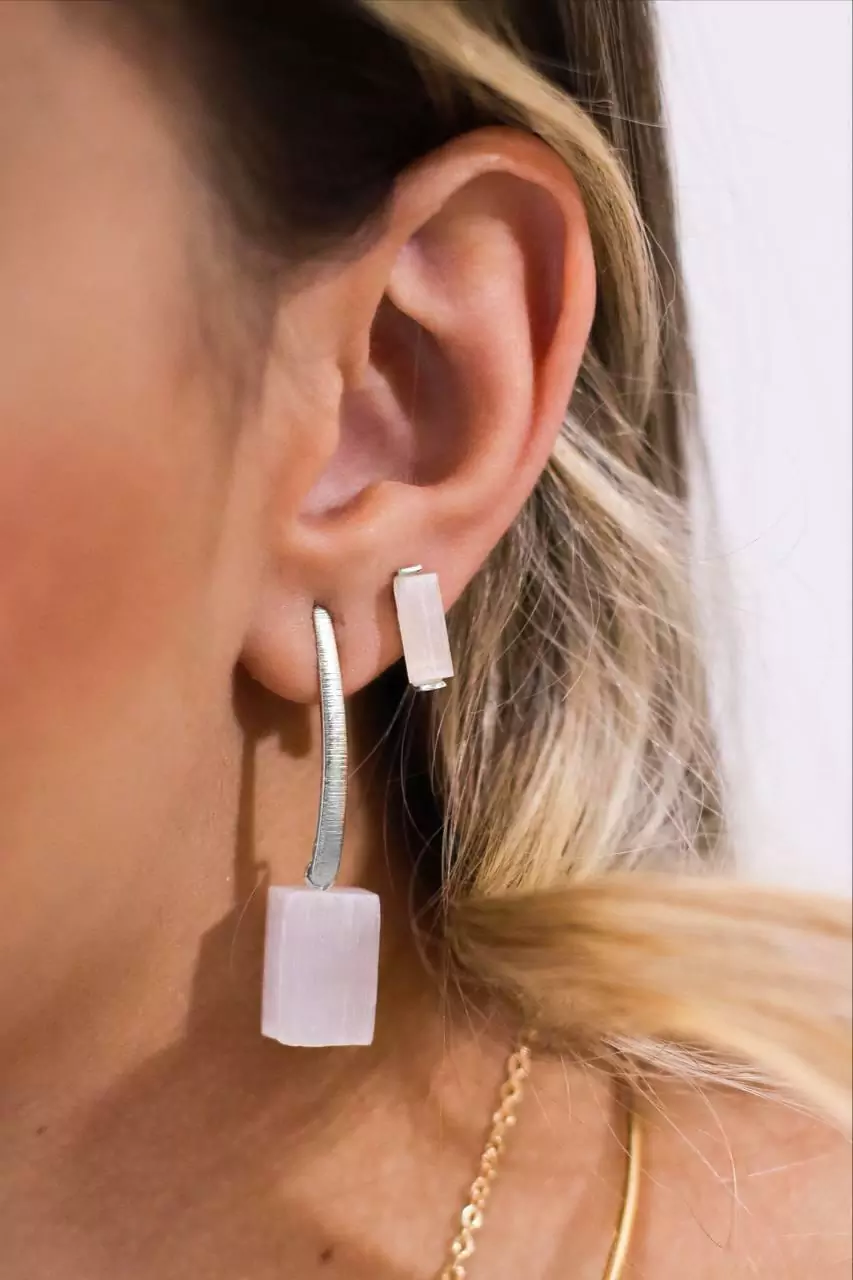 É uma joia exclusiva e delicada, que traz consigo a beleza e a perfeição das pedras naturais. Cada peça é cuidadosamente lapidada, para que o brilho da selenita branca seja realçado e encante a todos. A pedra é envolta em um banho de prata, que adiciona um toque luxuoso e elegante ao brinco.