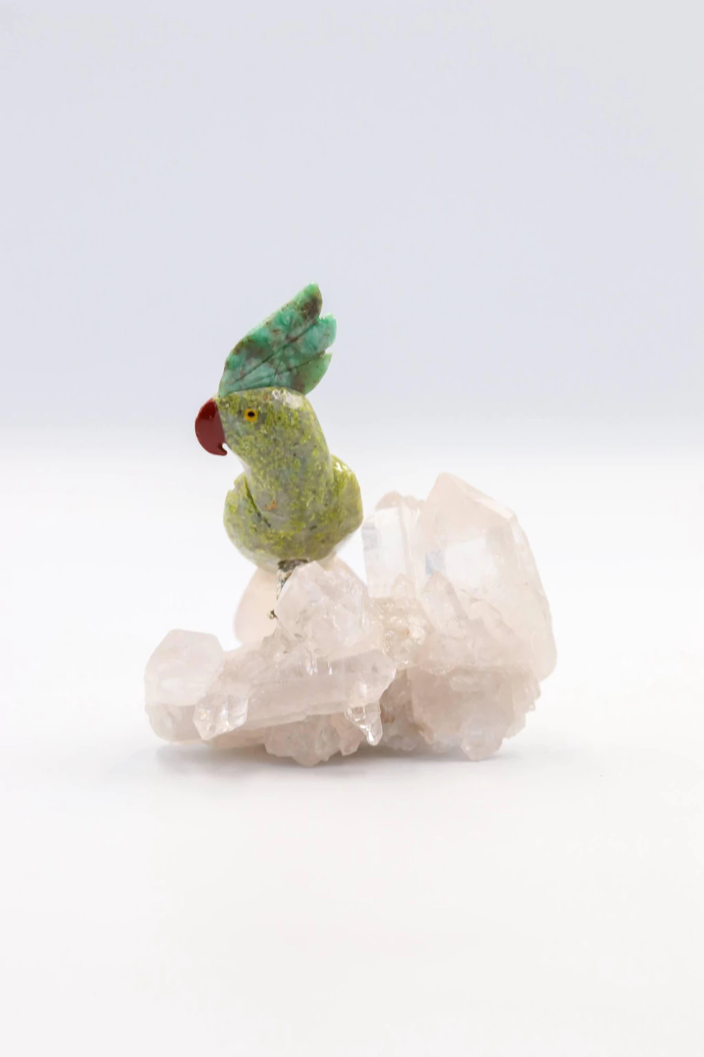 A Cacatua de Serpentinita, delicadamente posicionada sobre uma autêntica drusa de cristal, é uma peça de destaque para quem busca beleza, energia e sofisticação em um só item. Esculpida em serpentinita natural, essa ave exuberante representa a liberdade, a comunicação e a inteligência — atributos frequentemente associados à cacatua no simbolismo espiritual.