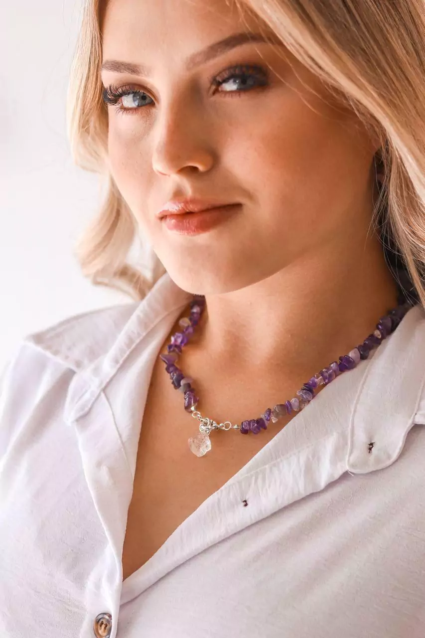 Choker Ametista com Cristal Fecho Boia Summer Vibes Banho Prata: Pedra Ametista é conhecida como pedra da transformação.