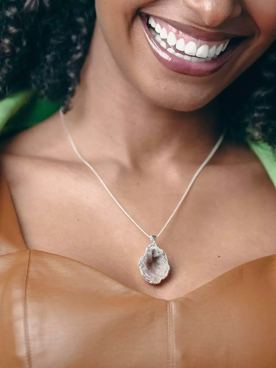 É uma peça exclusiva que combina a beleza rústica e única da natureza com o brilho luxuoso da prata. Esta peça, parte de nossa nova coleção, apresenta um geodo de ágata natural como peça central, cada um com seu próprio padrão e tonalidade únicos, tornando cada colar um item verdadeiramente único. A pedra natural é envolta em um banho de prata, adicionando um toque de elegância moderna a esta joia rústica.