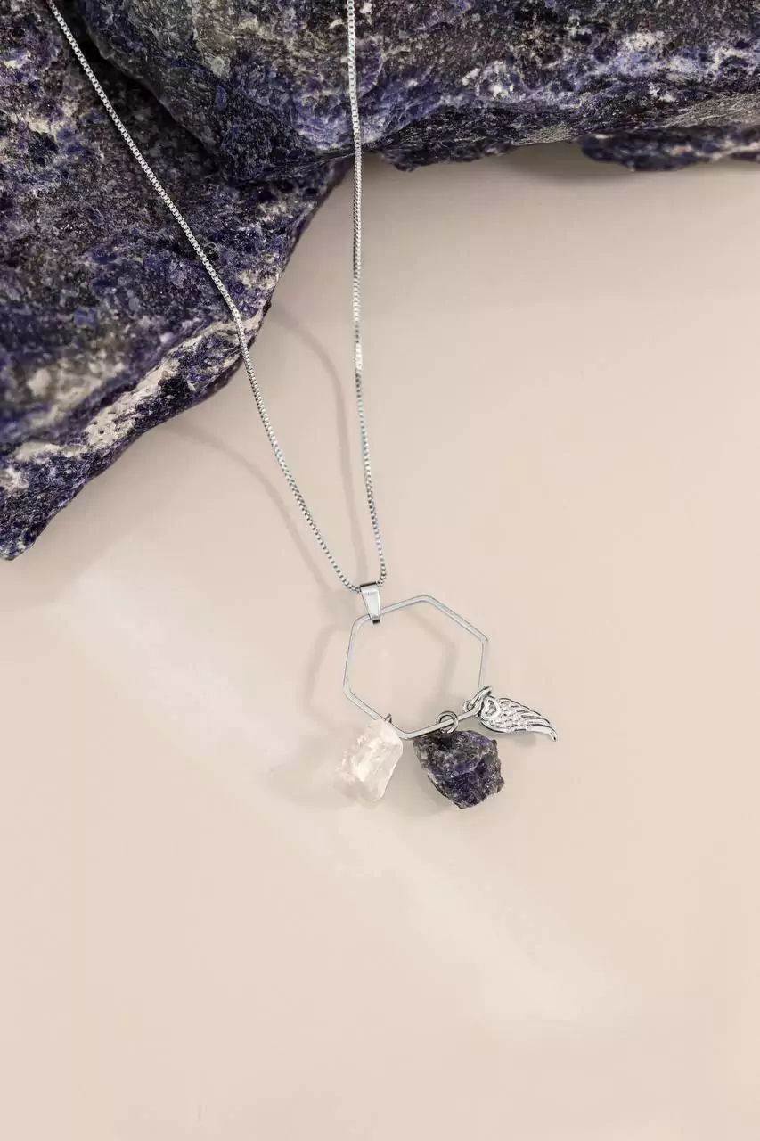 Este colar é a escolha perfeita para mulheres que buscam peças sofisticadas. O seu design moderno, juntamente com o pingente duo e o hexágono criam uma combinação envolvente de pedra bruta de sodalita e cristal, resultando em uma peça exclusiva. Trazendo um toque de sutileza da pedra bruta e o banho prata garante brilho e modernidade. Ele proporcionará um toque de elegância ao seu look, destacando sua personalidade e deixando você mais bela.