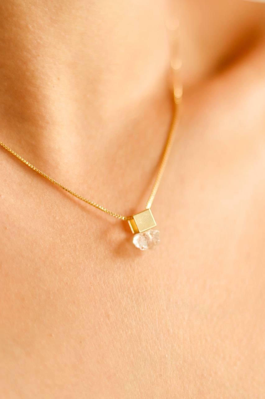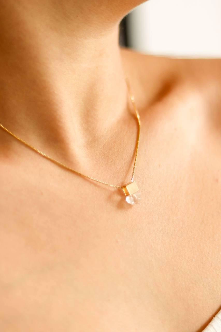 Delicadeza, sofisticação e energia em um só acessório. Este colar exclusivo combina um quartzo cristal bruto natural com um elegante suporte em formato de cubo com banho de ouro 18k, criando um contraste harmonioso entre o rústico da pedra e o brilho moderno do metal dourado. A corrente fina e delicada valoriza ainda mais o design minimalista da peça.
