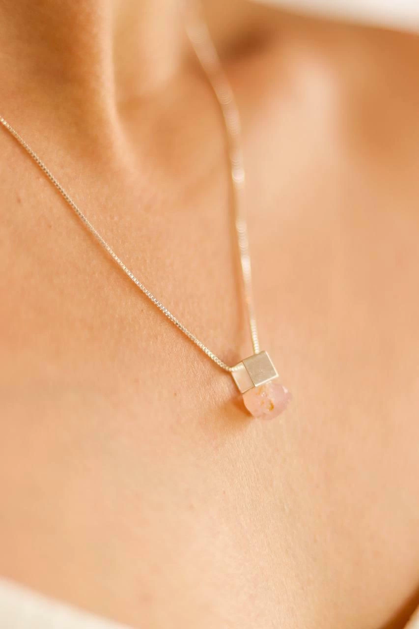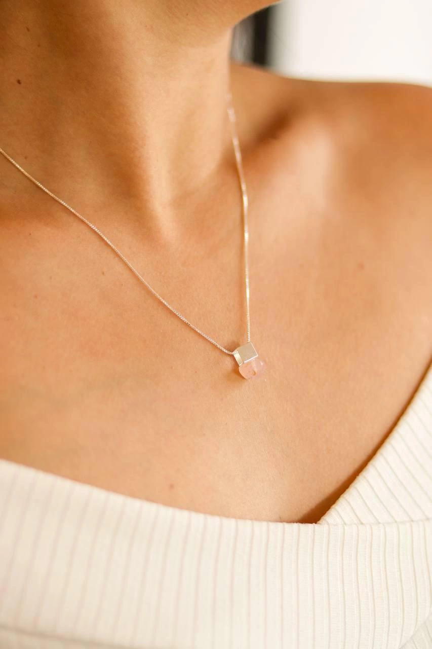 Este colar exclusivo combina um quartzo rosa bruto natural com um elegante suporte em formato de cubo com banho de prata, criando um contraste harmonioso entre o rústico da pedra e o brilho moderno do metal prateado. A corrente fina e delicada valoriza ainda mais o design minimalista da peça.