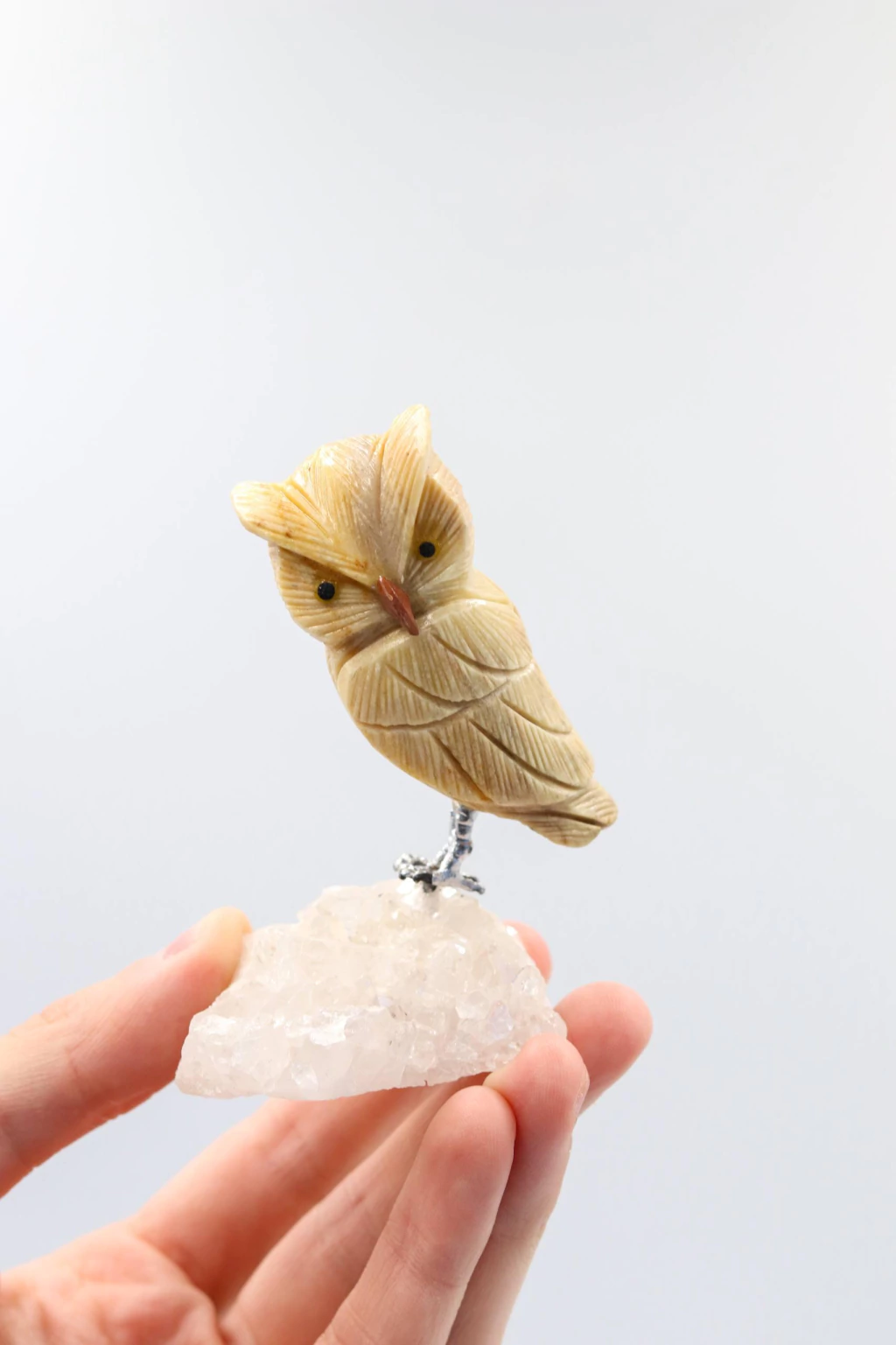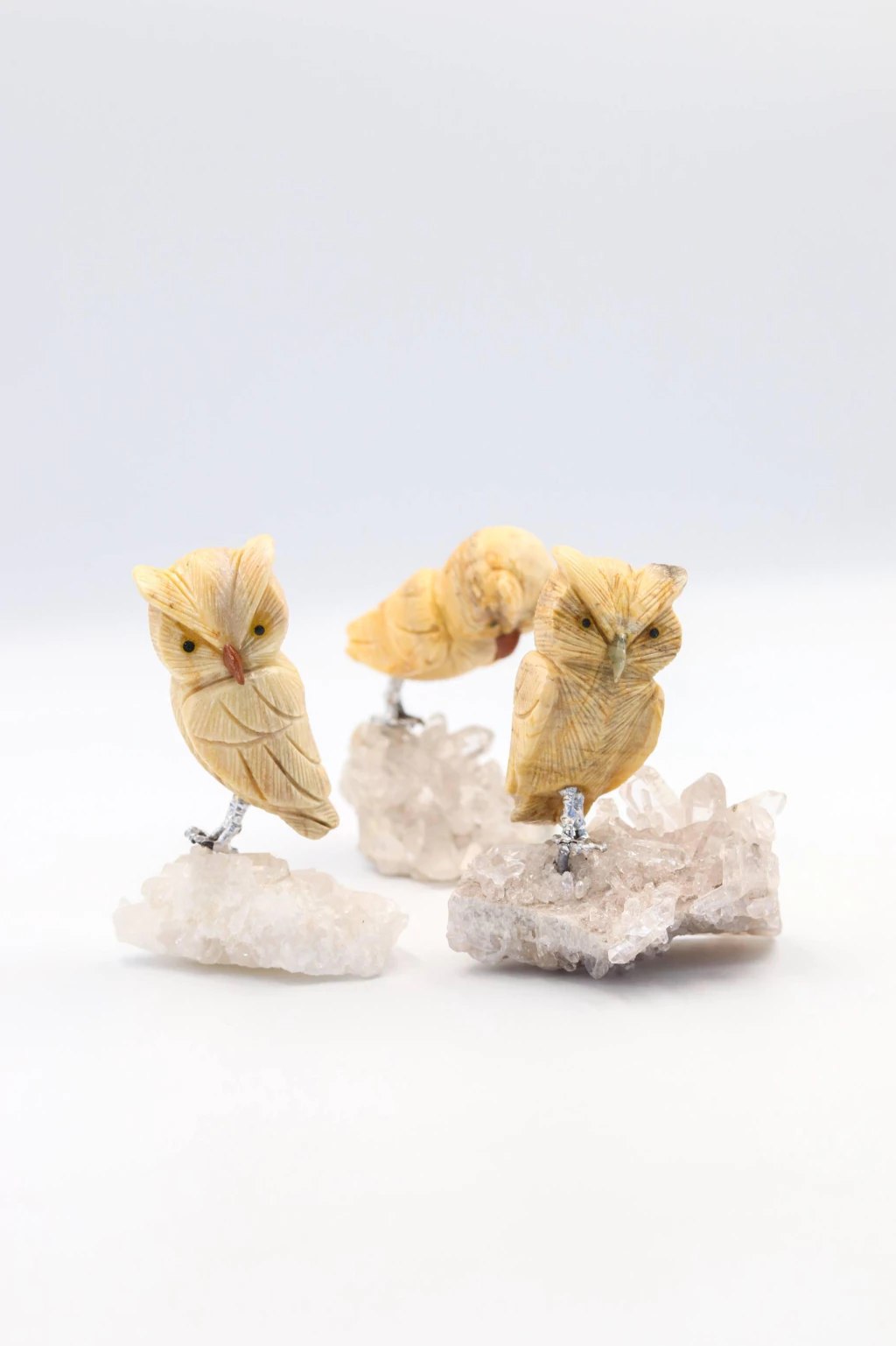 A coruja representa sabedoria, intuição e proteção espiritual. Esculpida em dolomita amarela, pedra associada à estabilidade emocional e força interior, ela ganha ainda mais destaque sobre a base de drusa de cristal, conhecida por sua capacidade de purificar ambientes e amplificar energias positivas.