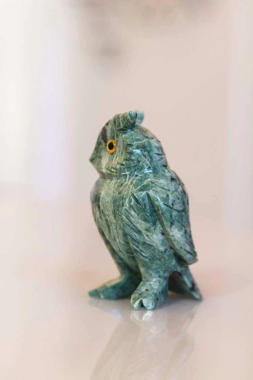 Escultura de coruja esculpida à mão em serpentinita natural. Com tons de verde únicos, representa sabedoria e proteção. Ideal para decoração, presentes ou colecionadores. Peça elegante e cheia de significado.