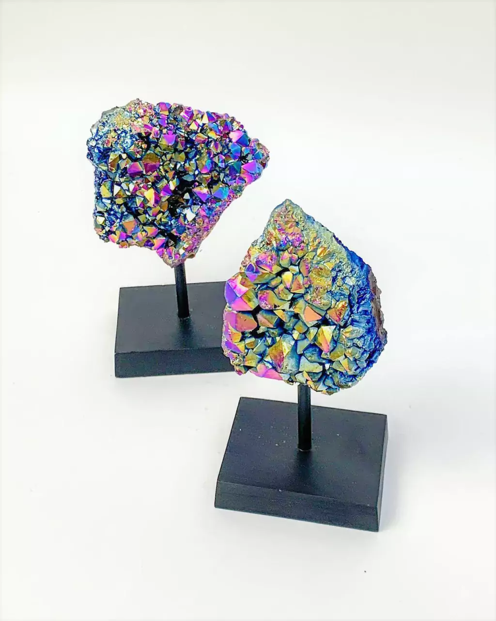 Drusa Quartzo Titânio Rainbow na Base Metal com Madeira Preta: Pedra Titânio é conhecida como pedra capacidade de expandir a consciência.