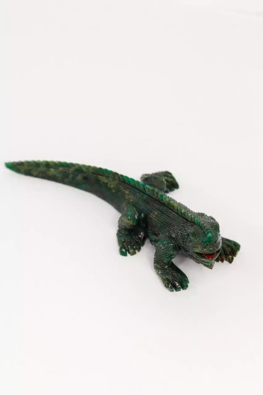Esta escultura de iguana é uma peça decorativa única, confeccionada meticulosamente na pedra serpentinita. Com sua aparência realista e detalhes intrincados, esta peça traz um toque de natureza e elegância para qualquer ambiente, seja ele clássico ou moderno.