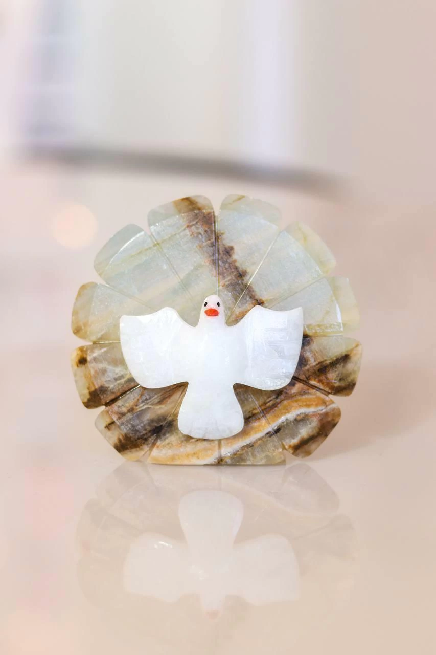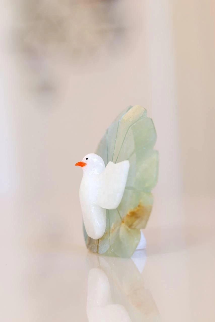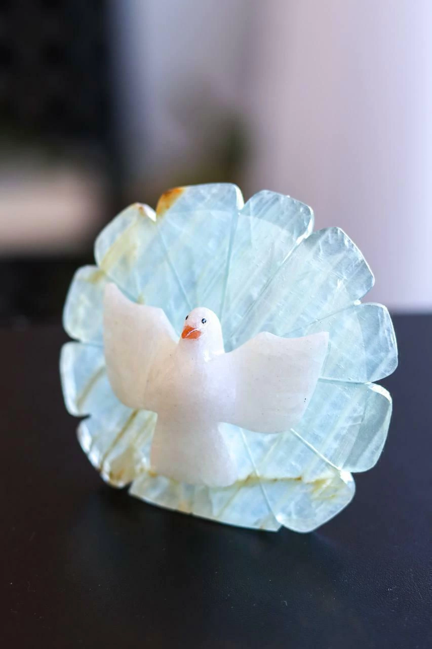 Uma peça delicada e simbólica, esta escultura apresenta uma pomba da paz esculpida em pedra dolomita branca, sobre uma base floral em pedra ônix azul com veios naturais. Trabalhada artesanalmente, transmite harmonia, espiritualidade e pureza – ideal para ambientes que pedem serenidade e significado.