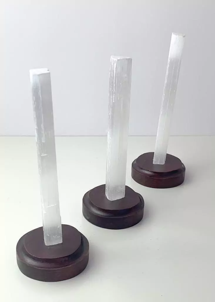 Pedra Selenita Branca na Base de Madeira Marrom: A pedra Selenita branca é conhecida como pedra de limpeza.