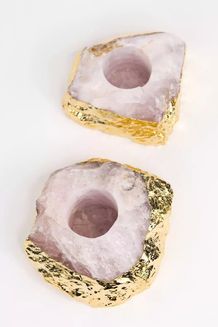 Porta Vela Quartzo Rosa Com Banho Ouro: