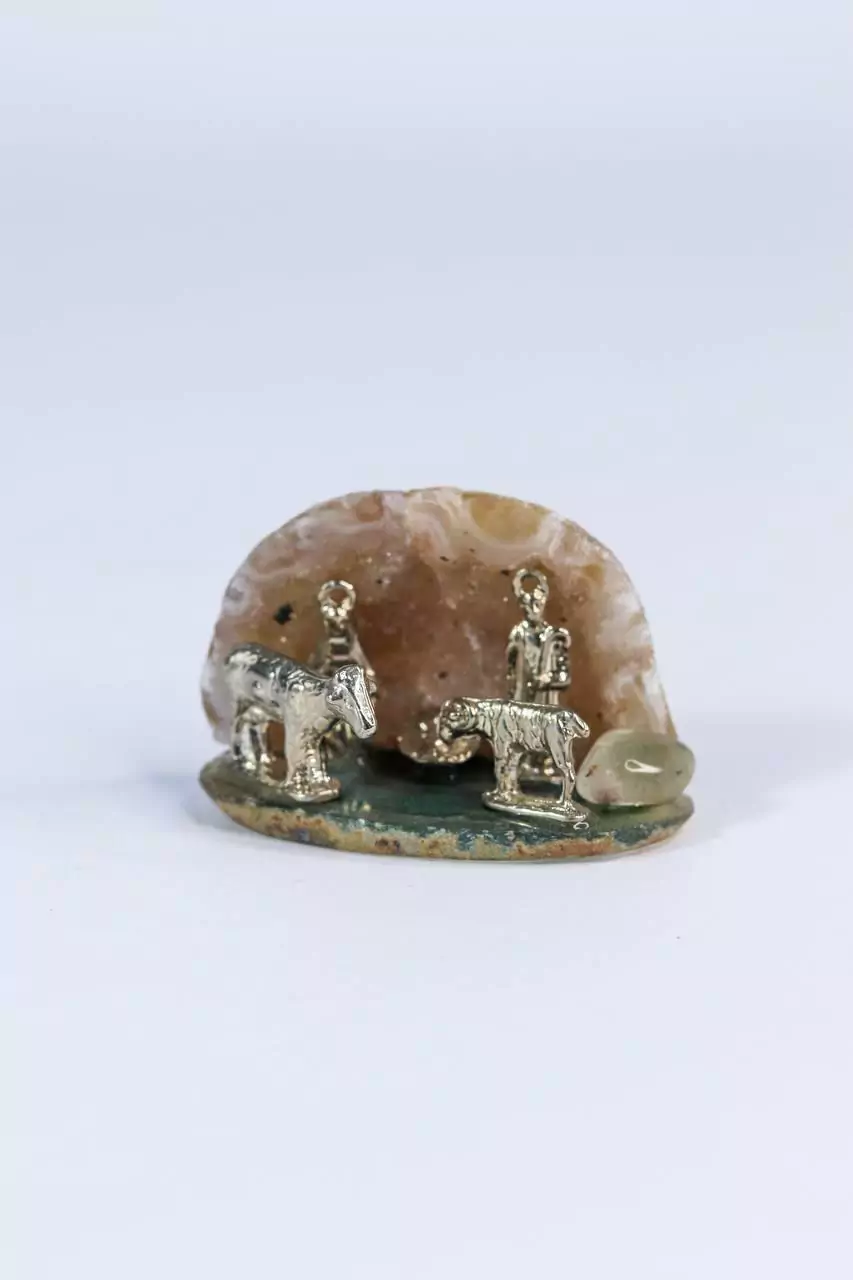 O presépio é estruturado em cima da chapa de ágata verde, esta pedra natural possui uma beleza única, com suas cores suaves e traços naturais que conferem uma autenticidade encantadora à peça. Cada presépio é cuidadosamente lapidado e polido à mão, garantindo a qualidade e a delicadeza que só uma peça artesanal pode oferecer.