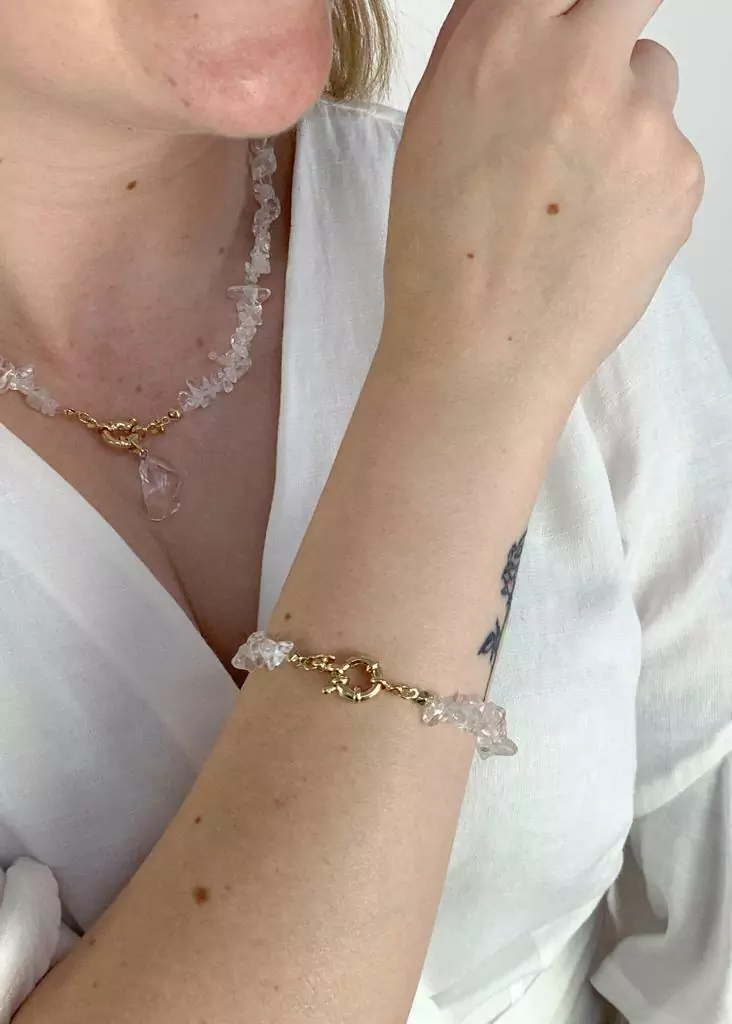 Esta pulseira é para mulheres que buscam um acessório moderno. Com pedras cascalho de cristal de quartzo e um fecho boia banhado a ouro, essa pulseira fica lindo em seu pulso. Ela pode ser utilizada no dia a dia ou em ocasiões especiais adicionando um toque de estilo ao seu look.