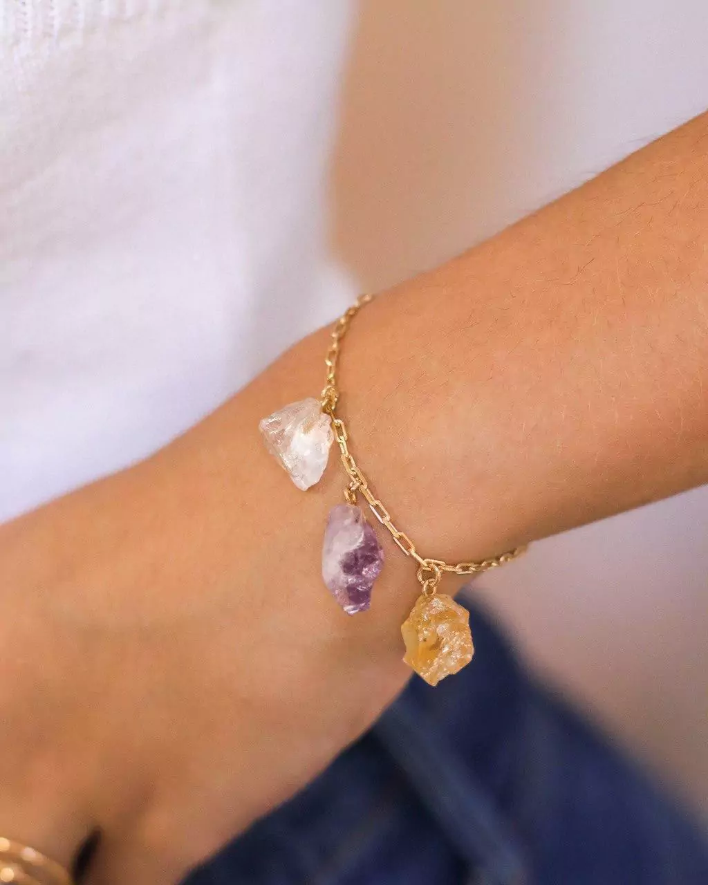 Pulseira Trio de Pedras Brutas Banhado Ouro Descubra a energia e a beleza natural das pedras com a nossa Pulseira Trio de Pedras Brutas Banhado Ouro. Esta peça exclusiva reúne três pedras poderosas: Ametista, Cristal e Citrino, cada uma escolhida por suas propriedades únicas e benefícios energéticos.